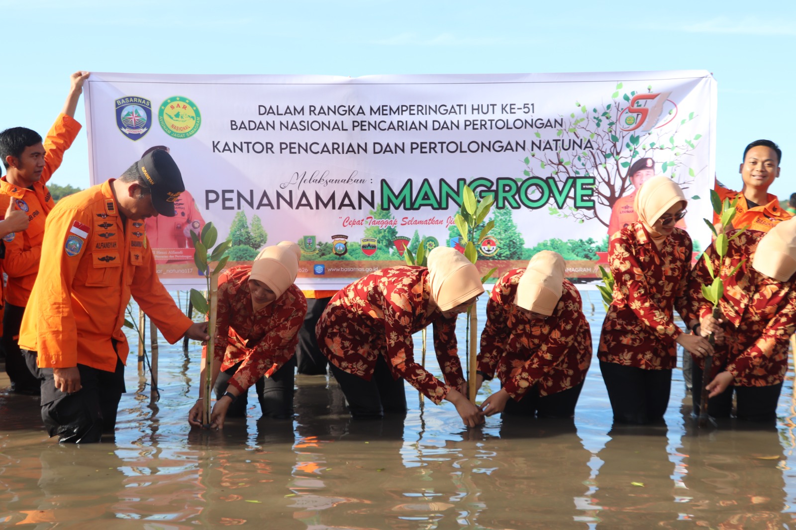 Natuna (DKN) – Kantor Pencarian dan Pertolongan Natuna (Kansar Natuna) peringati HUT Basarnas yang ke 51 dengan melakukan penanaman Mangrove di kota tua Penagi, Kabupaten Natuna, Selasa (14/02).