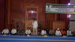 Natuna (DKN) – Bupati Natuna, Wan Siswandi melepas 46 orang Calon Jemaah Haji (CJH) kelompok terbang (Kloter) embarkasi Batam (BTH) asal Kabupaten Natuna, Kepulauan Riau (Kepri), di Masjid Agung Natuna, Sabtu pagi (11/06).