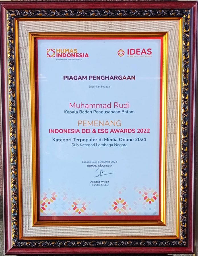 Batam (DKN) – Kepala Badan Pengusahaan (BP) Batam, Muhammad Rudi dianugerahi penghargaan sebagai Pemimpin Lembaga Negara Terpopuler di Media Online Sepanjang Tahun 2021 oleh Humas Indonesia dalam acara The 1st IDEAS 2022 yang diselenggarakan di Hotel Meruorah, Labuan Bajo, Nusa Tenggara Timur pada Jum’at (05/08/2022).