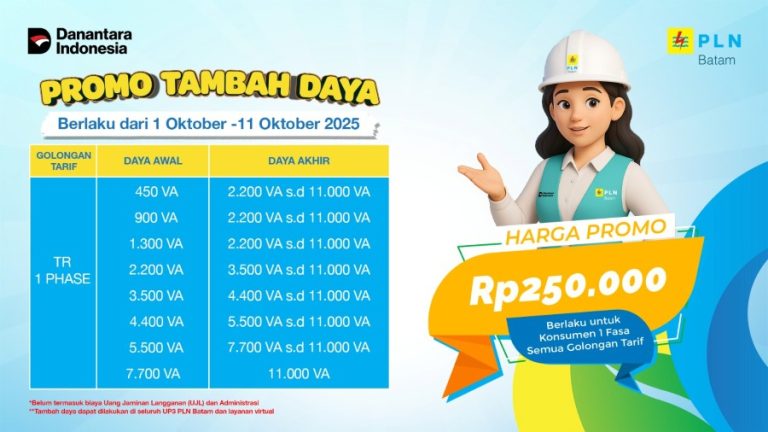 Batam (DKN) – Dalam rangka memperingati Hari Ulang Tahun ke-25, PT PLN Batam meluncurkan program spesial bertajuk Gebyar Energi Perak dengan slogan “Dari Cahaya Perak Menuju Energi Masa Depan”. Program ini memberikan promo biaya penyambungan tambah daya bagi seluruh pelanggan 1 phasa.