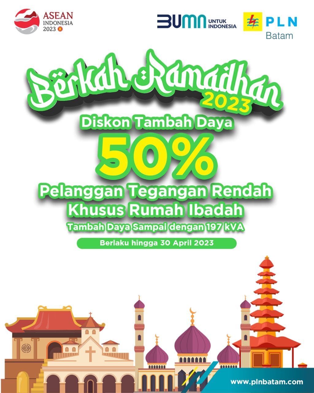 Batam (DKN) – Dalam rangka memeriahkan hadirnya bulan suci Ramadhan 1444 Hijriah, PT PLN Batam menghadirkan promo diskon untuk mendukung pemakaian listrik pada semua rumah ibadah (Mesjid, Gereja, Vihara dan Pura) yang ingin tambah daya listrik melalui Program “Berkah Ramadhan”. Promo ini berupa pemberian harga spesial berupa diskon sebesar 50% biaya penyambungan layanan tambah daya bagi semua pelanggan rumah ibadah yang berlaku hingga 30 April 2023.