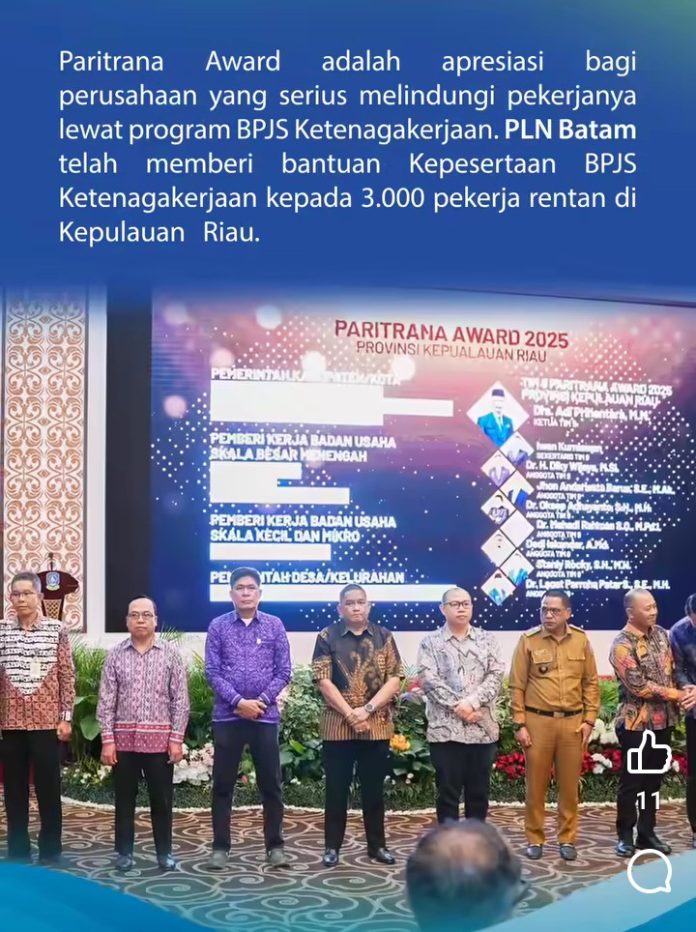“Dengan diterimanya Paritrana Award ini, PLN Batam semakin memperkuat posisinya sebagai perusahaan yang tidak hanya unggul secara teknis dan bisnis, tetapi juga unggul secara sosial dan tata kelola sumber daya manusia,” ujar Samsul.