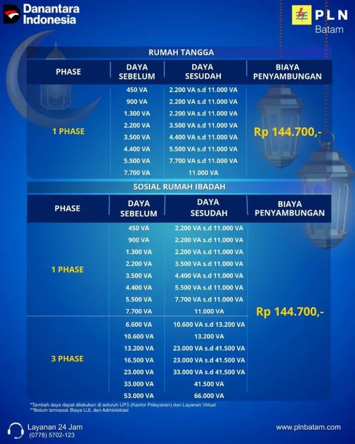 Batam (DKN) – Kesempatan menikmati sambut Ramadan dengan listrik yang lebih andal, PLN Batam menghadirkan Promo Tambah Daya hanya Rp144.700 untuk pelanggan rumah tangga dan rumah ibadah.