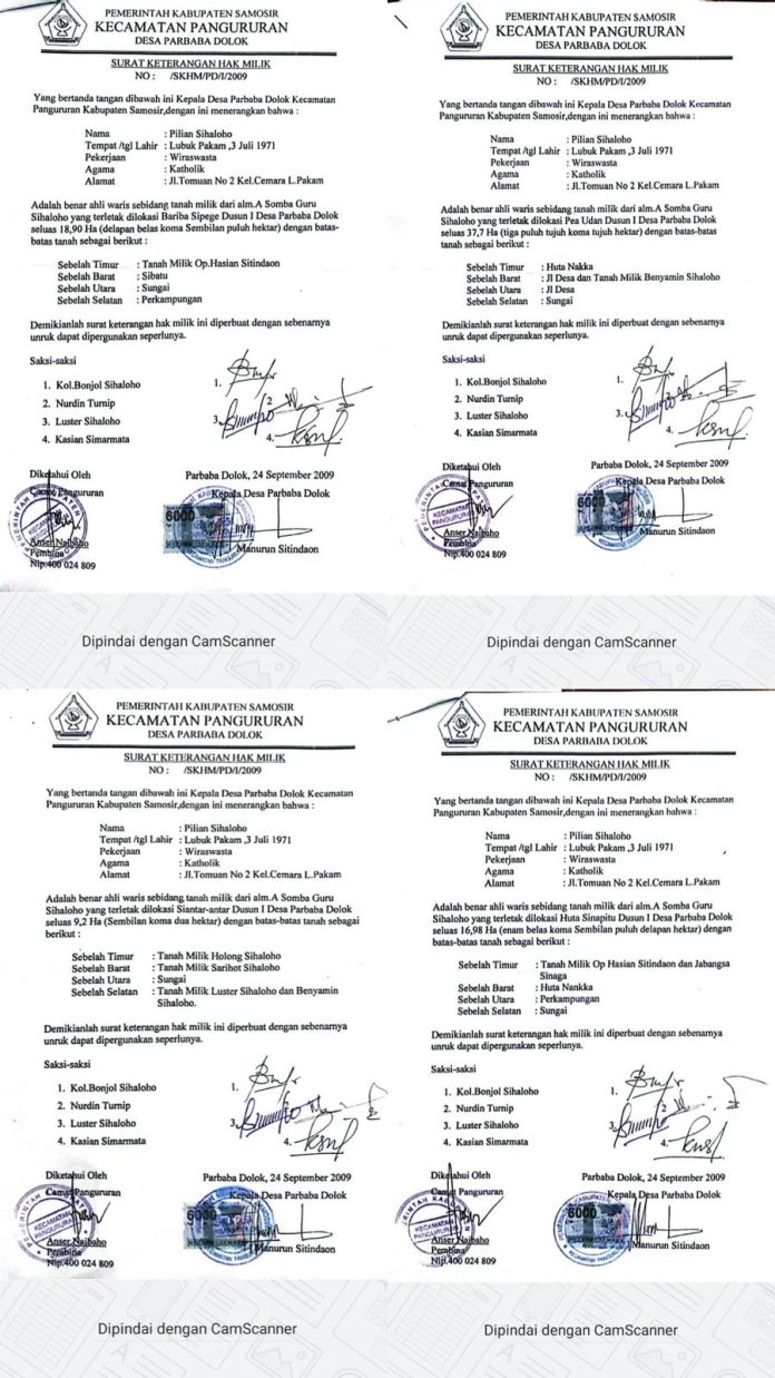 Samosir (DKN) – Berdasarkan Empat Surat Keterangan Hak Milik Tanah (SKHM) yang ditandatangani oleh Kepala Desa Parbaba Dolok pada tanggal 24 September 2009 yang lalu menegaskan kepemilikan sah ahli waris Am Somba Guru atas sebidang tanah di Desa Parbaba Dolok.